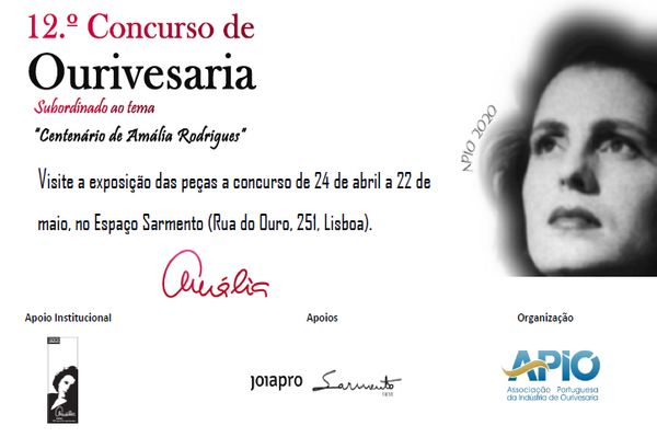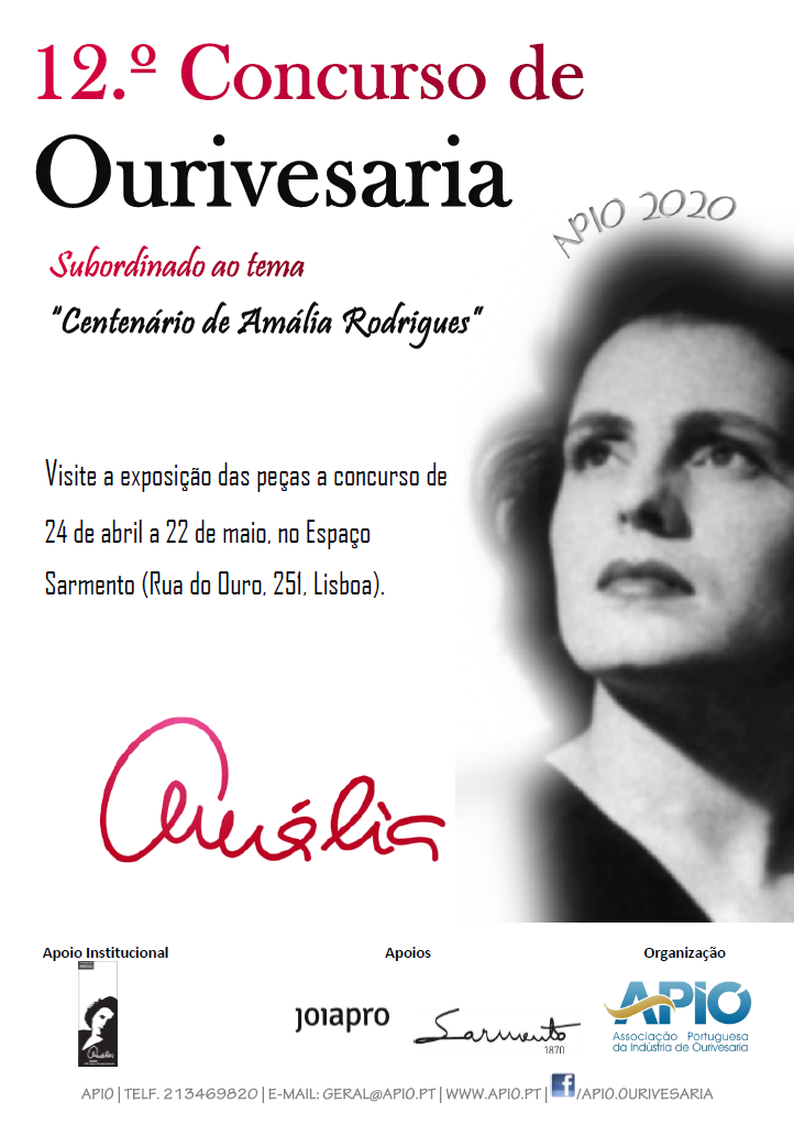A partir de amanhã, sábado – 24 de abril, é possível visitar a exposição das 11 peças concorrentes à 12.ª edição do Concurso de Ourivesaria da APIO subordinado ao tema “Centenário de Amália Rodrigues” no nosso parceiro habitual, Ourivesaria Sarmento – Rua do Ouro, 251, Lisboa.