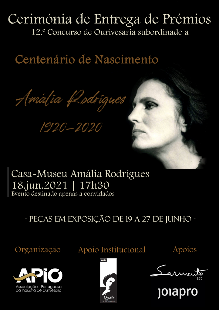 A Cerimónia de Entrega de Prémios do 12.º Concurso de Ourivesaria terá lugar no dia 18 de junho às 17h30 na Casa Museu Amália Rodrigues. Como tem vindo a ser anunciado, este evento será de carácter privado e destina-se meramente a convidados.