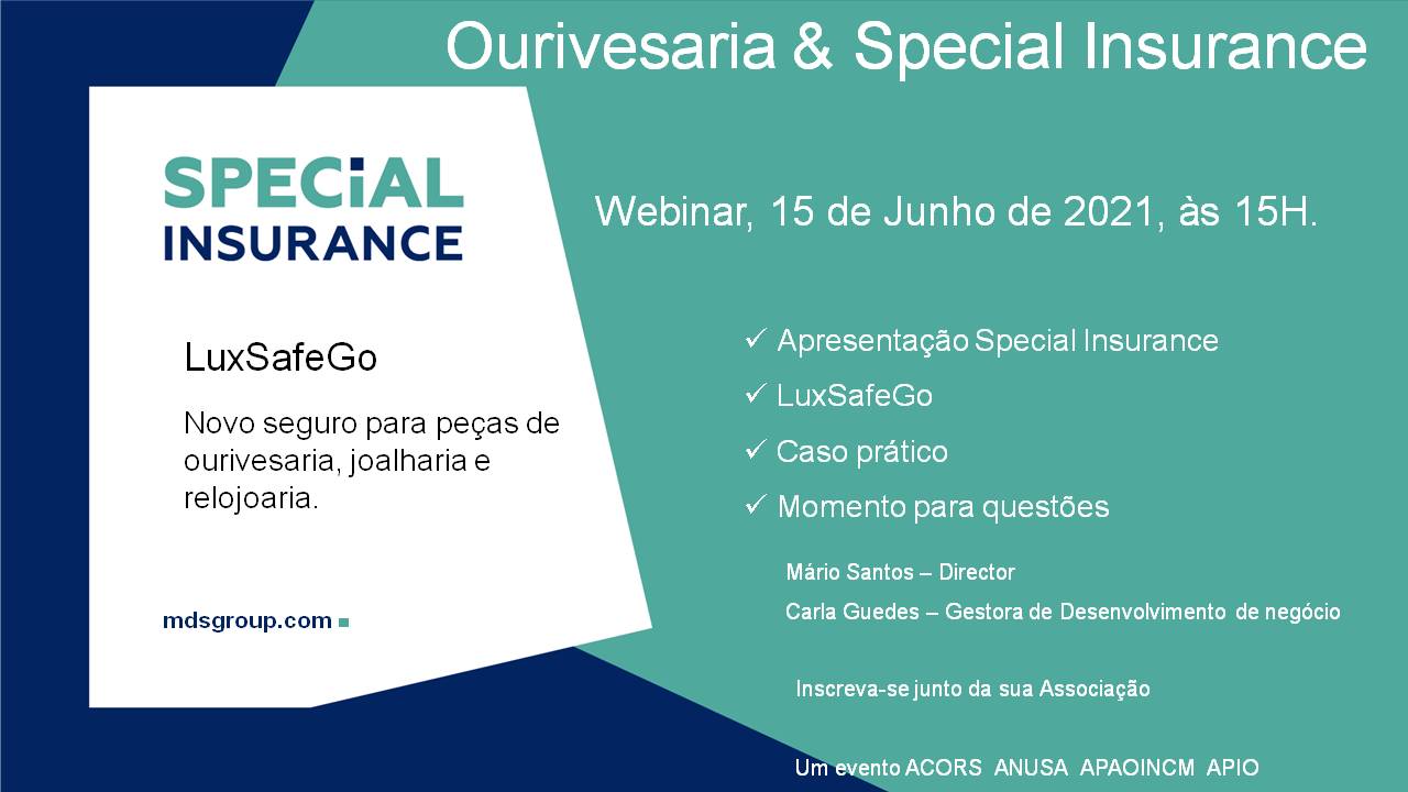 Numa organização conjunta da APIO, ACORS, ANUSA e APAOINCM, apresentamos o webinar "Ourivesaria e Special Insurance", dedicado ao tema de seguros em ourivesaria e que irá apresentar um produto que poderá ser do interesse para a maioria dos associados.