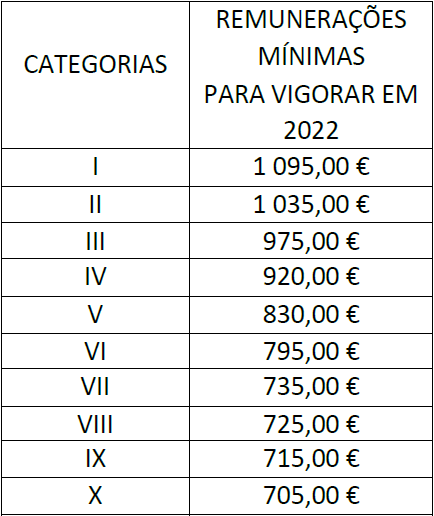 O processo seguirá agora os trâmites normais para publicação no Boletim de Trabalho e Emprego informando-se, por agora, que em resultado das negociações, foi acordada a atualização do subsídio de refeição para um valor mínimo de 5,00 € por cada dia completo de trabalho efetivamente prestado e a seguinte tabela salarial a vigorar durante o ano de 2022, com efeitos retroativos a partir de 1 de janeiro: