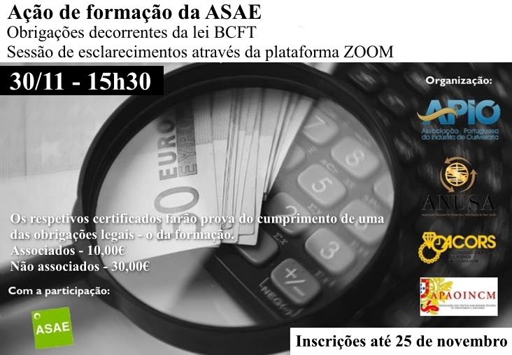 A APIO em conjunto com a ANUSA, ACORS e APAOINCM confirma a data de 30 de novembro, pelas 15h30, para a ação de formação em Branqueamento de Capitais e Financiamento do Terrorismo em parceria com a ASAE, via plataforma zoom.