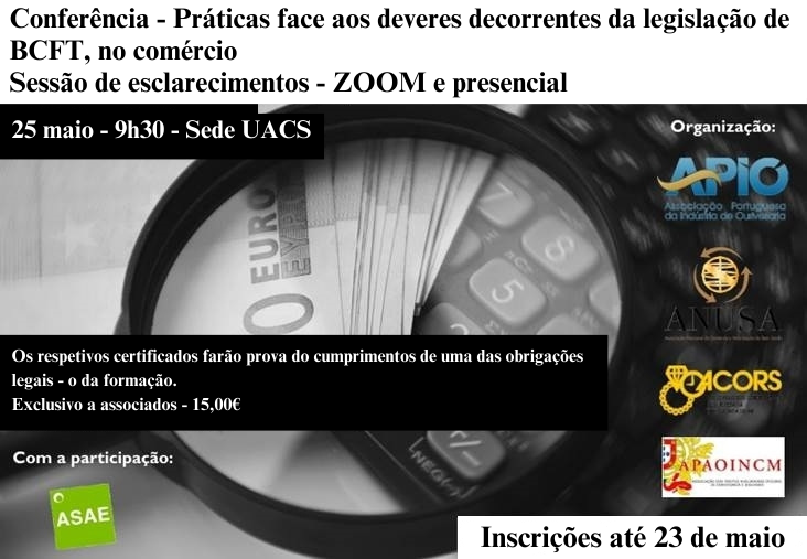 A APIO em conjunto com a ACORS, ANUSA, APAO e com o apoio da UACS confirma a data de 25 de maio, pelas 9h30, para a Conferência em “Práticas face aos deveres decorrentes da legislação de BCFT, no comércio”. Esta sessão será presencial, na Sede da UACS – Lisboa e será também transmitida via ZOOM.