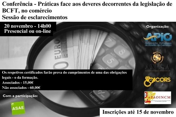 A APIO em conjunto com a ACORS, ANUSA, APAO e com o apoio da UACS confirma a data de 20 de novembro, pelas 14h00, para a Conferência em “Práticas face aos deveres decorrentes da legislação de BCFT, no comércio”. Este evento é fundamental para todos os envolvidos no comércio (pessoas que exerçam funções nas áreas do atendimento ao público, promoção de negócios, vendas, contabilidade, financeira e os dirigentes/representantes legais) e tem como objetivo esclarecer as práticas necessárias para cumprir a legislação BCFT.
