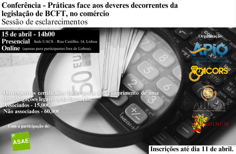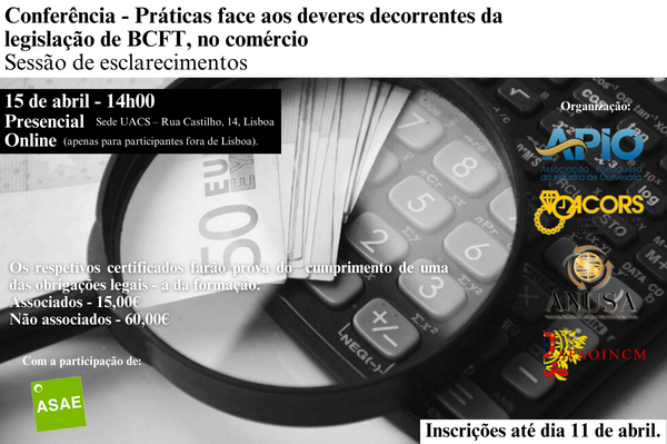 A APIO em conjunto com a ACORS, ANUSA, APAO e com o apoio da UACS confirma a data de 15 de abril, pelas 14h00, para a Conferência em “Práticas face aos deveres decorrentes da legislação de BCFT, no comércio”. Esta sessão será presencial, na Sede da UACS – Lisboa e será também transmitida via ZOOM para participantes fora de Lisboa.