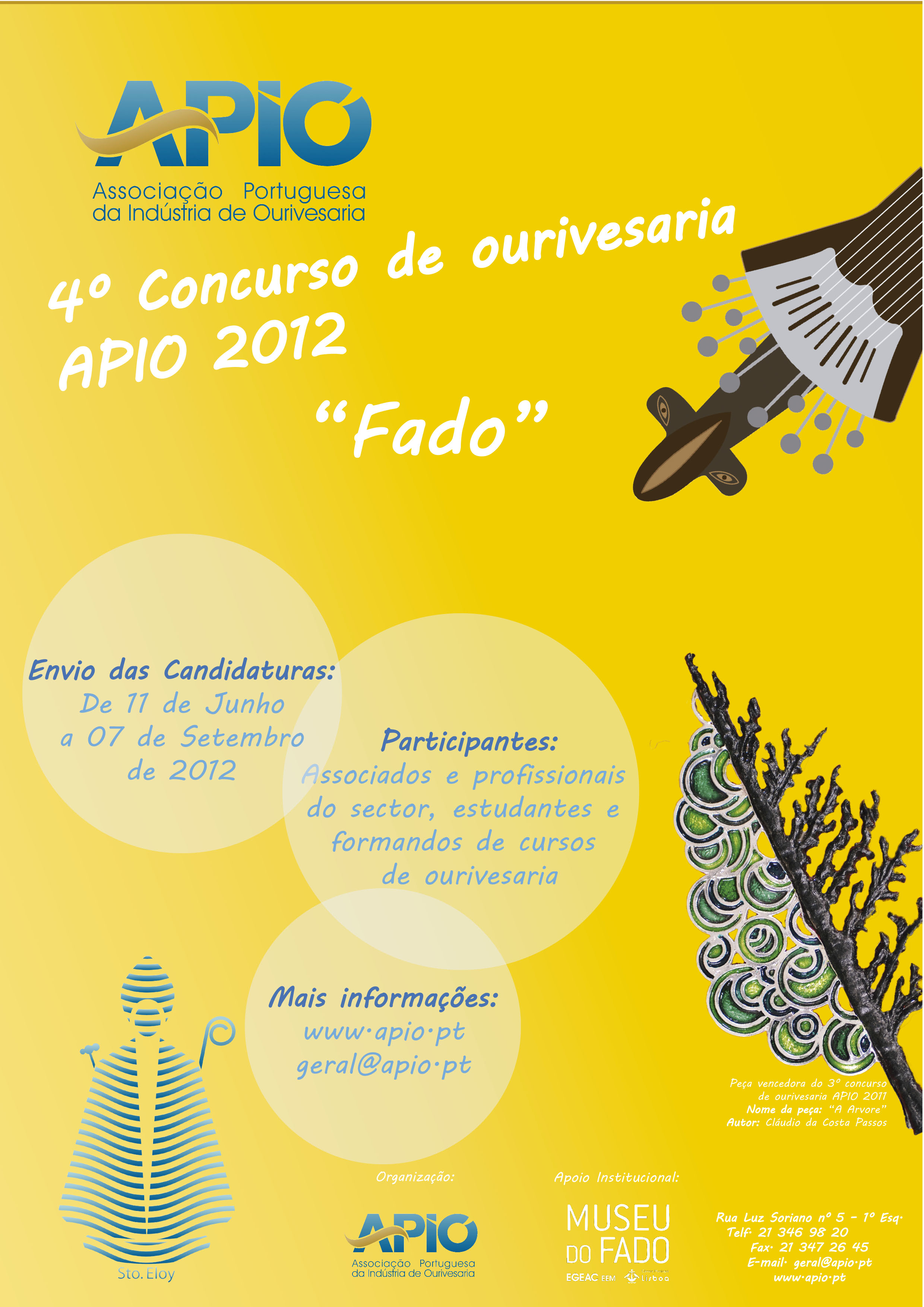 A inscrição do Fado na Lista Representativa do Património Cultural e Imaterial da Humanidade pela UNESCO, no dia 27 de Novembro de 2011, é um motivo de orgulho para todos os portugueses e ao seleccionar o tema “Fado” para a quarta edição do seu concurso de ourivesaria a APIO pretende homenagear e associar-se a essa conquista. O concurso "APIO 2012" é dedicado ao tema Fado e já estão disponíveis para download o regulamento, a ficha de inscrição e a declaração. ficheiros/conteudos/files/ficha de inscrição concurso(1).pdf