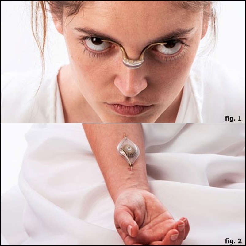 As três peças que compõem este conceito de "joalharia energética" são: o Blinker (inserida na ponte do nariz, fig.1), o E-pulse Conductor (encaixado abaixo da nuca) e o Blood Bridge ( inserida no antebraço, fig.2). São joias que, quando utilizadas, extraem teoricamente energia das veias de quem as usa. Essa energia é utilizada depois pela própria peça. O projeto " Viciados em Energia" é da autoria de Naomi Kizhner. A designer e estudante de pós- graduação industrial de Hadassah College, em Jerusalém, concebeu três peças (o Blinker, o E- Pulse Concuctor e o Blood Bridge.) que são incorporadas nas veias de quem as usa. Desta forma as joias aproveitam o sangue do utilizador para fazer funcionar pequenos mecanismos dentro dos dispositivos.
