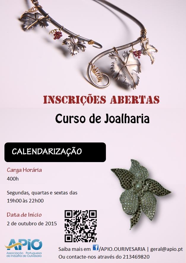 Apresentamos-lhe, em primeira mão, o cartaz alusivo ao Curso de Joalharia que irá decorrer no Centro de Formação da APIO, a iniciar já no dia 2 de outubro. Trata-se de um curso de 400h, distribuídas entre segundas, quartas e sextas, das 19h00 às 22h00.