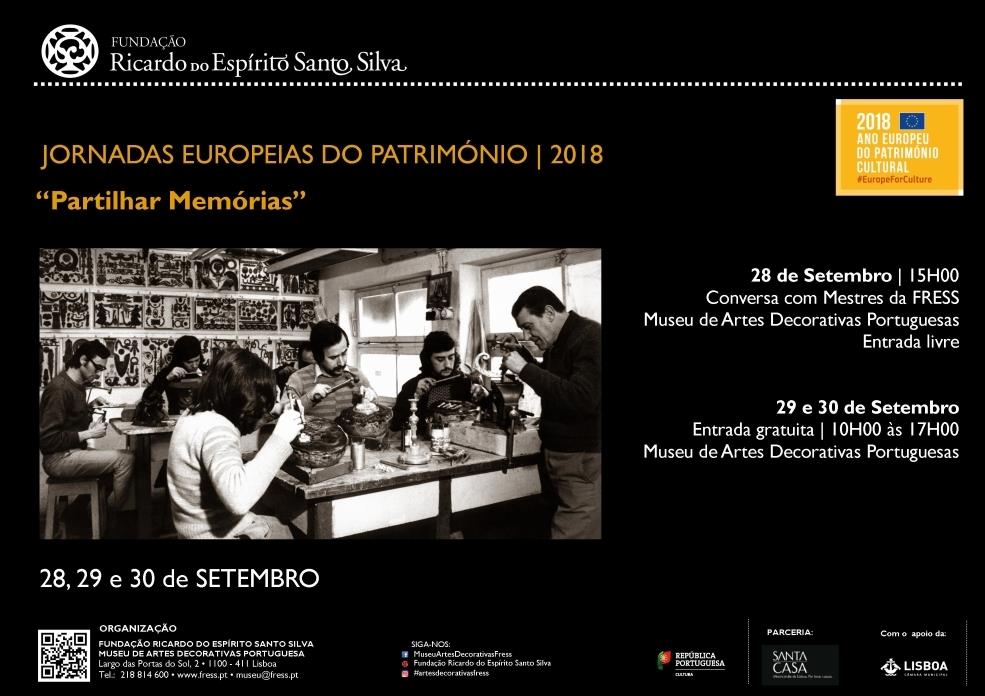 A Fundação Ricardo do Espírito Santo Silva (FRESS) associa-se mais uma vez às Jornadas Europeias do Património que se comemoram nos próximos dias 28, 29, e 30 de Setembro, com o tema “Partilhar Memórias”. Promove uma conversa com antigos e atuais Mestres da Fundação na Sala dos Chavões do Museu de Artes Decorativas Portuguesas, no dia 28, às 15h00. No fim-de-semana (29 e 30 de Setembro) a entrada é gratuita no Museu de Artes Decorativas Portuguesas