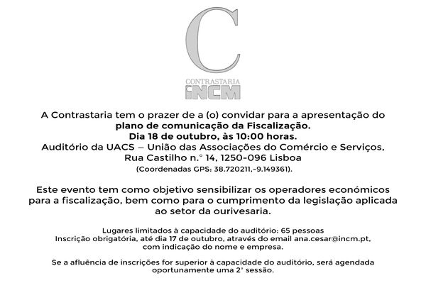 As inscrições devem ser efetuadas até ao dia 17 de outubro através do email ana.cesar@incm.pt com indicação do nome e empresa.
